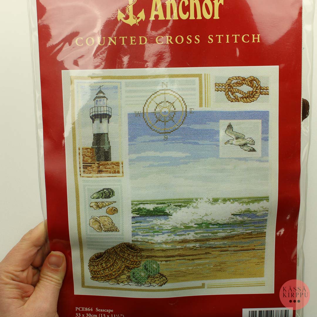 Paketissa ohje, kangas ja lankoja kauniiseen meriaiheiseen ristipistotyöhön. 33x30 cm.
