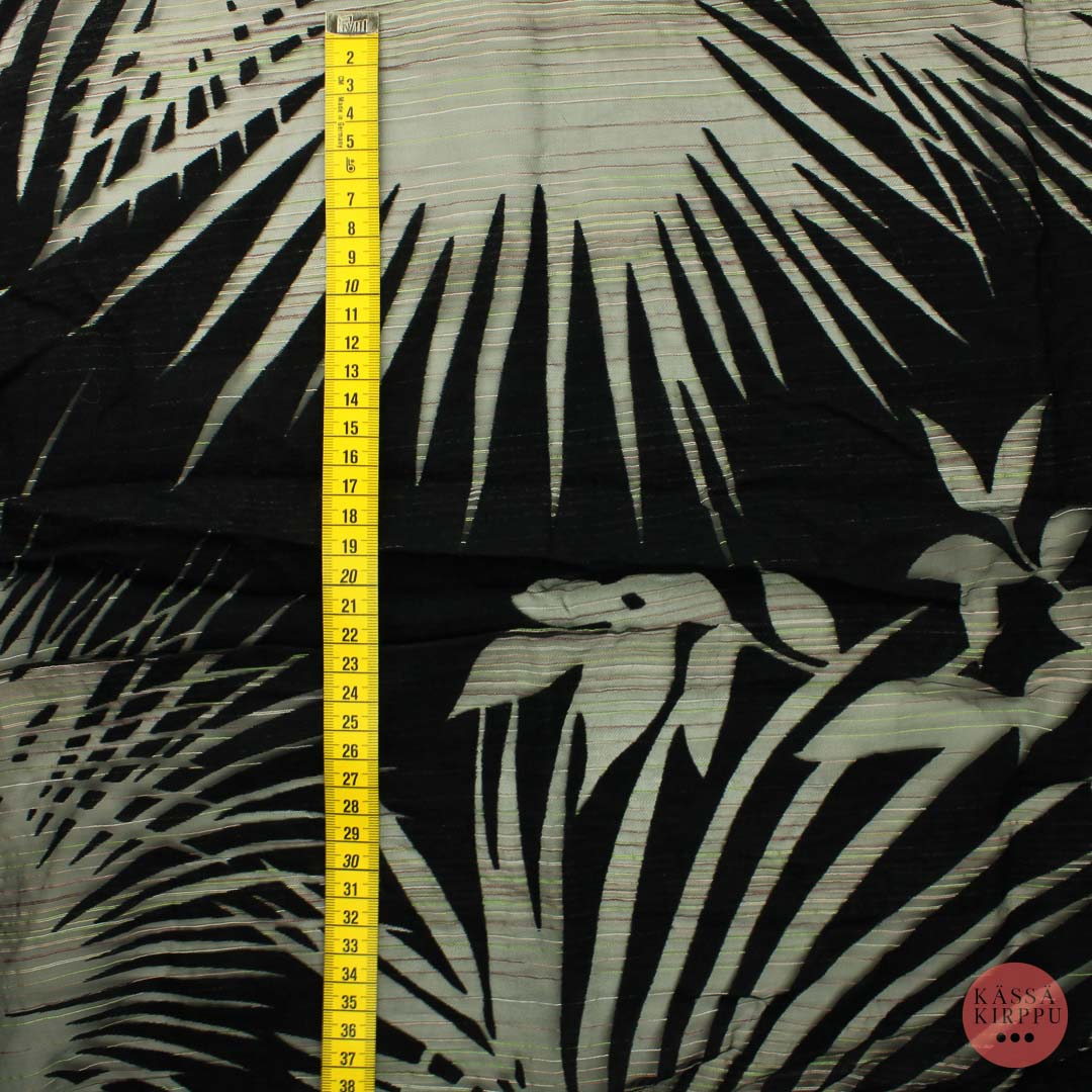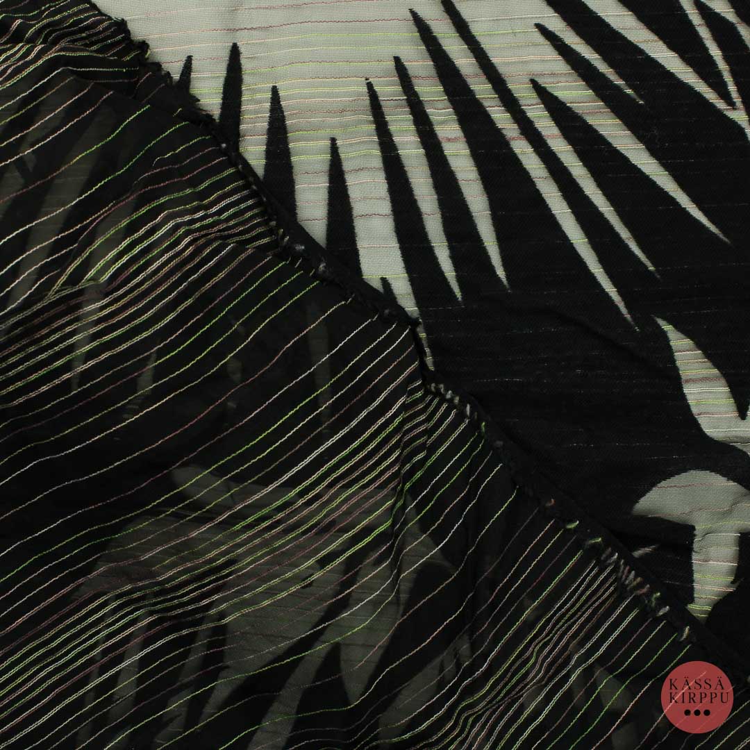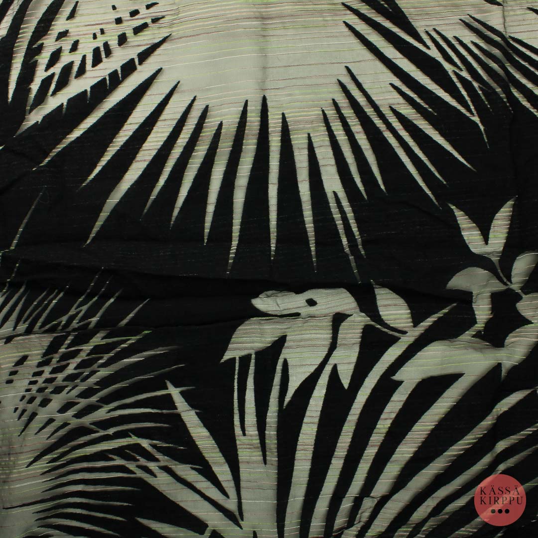 Ohut, harsomaisella pohjalla mustat paksummat peittävät kuviot, muu osa läpinäkyvää. Poikittain ohuita vaaleanvihreitä ja vaaleanpunaisia kudottuja lankoja. Sopii esim. pieneen kappaan tai toisen kankaan kanssa yhdessä muihin töihin. Kangas pesty.