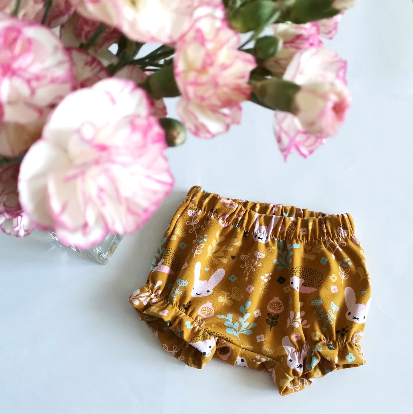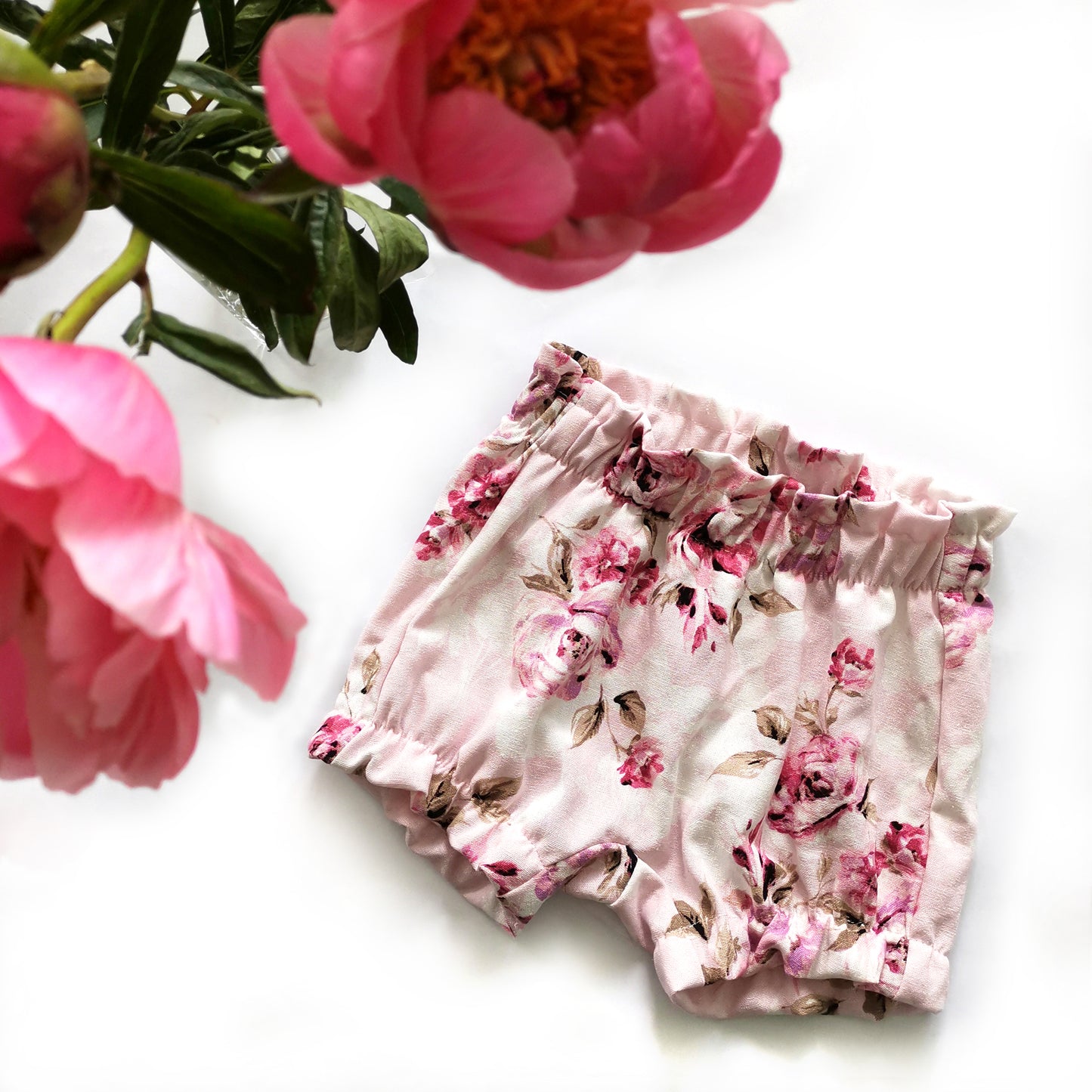 Tämä kaava sisältää paperikaavat ja suomenkieliset kuvalliset ohjeet pienten lasten PomPom-bloomersien ompeluun.