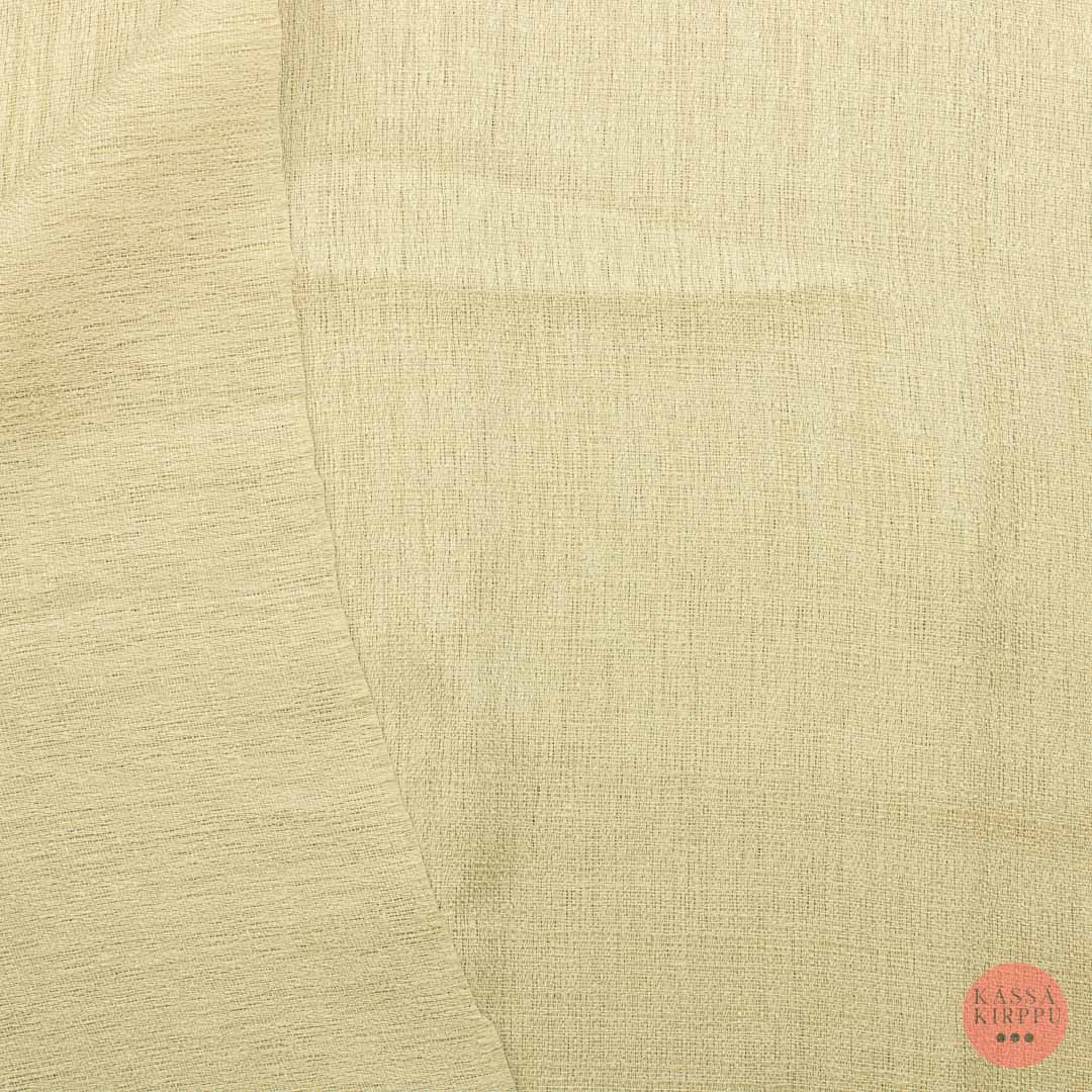 Keskipaksu, harvahkosidoksinen ja läpinäkyvä valoverhokangas. Osa langoista kiiltää hiukan.