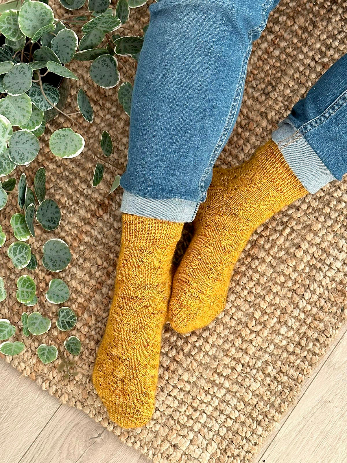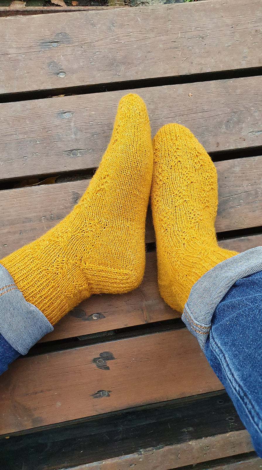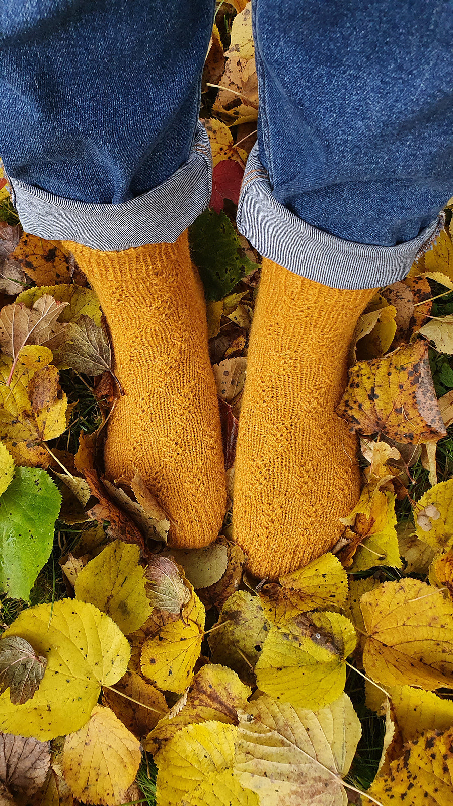 Elo-sukat neulotaan varpaista varteen fingering-vahvuisella langalla. Silmukat luodaan Judy’s Magic cast on -tekniikalla ja neulominen jatkuu kaavion avulla. Näitä sukkia koristaa tähkäkuviot, jotka syntyvät palmikonkierroilla. Ohjeessa on kolme eri kokoa, mutta vaihtamalla langan paksuutta tai puikkokokoa, saat vielä enemmän kokovaihtoehtoja.