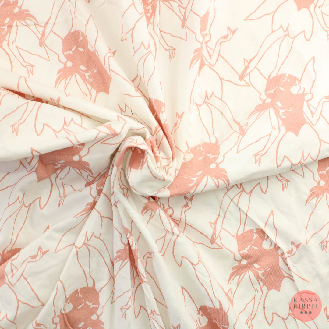 Keskipaksu, pehmeä ja joustava puuvilla-elastaanitrikoo. Pesussa hieman värjääntynyt, pohja ei puhtaan valkoinen.