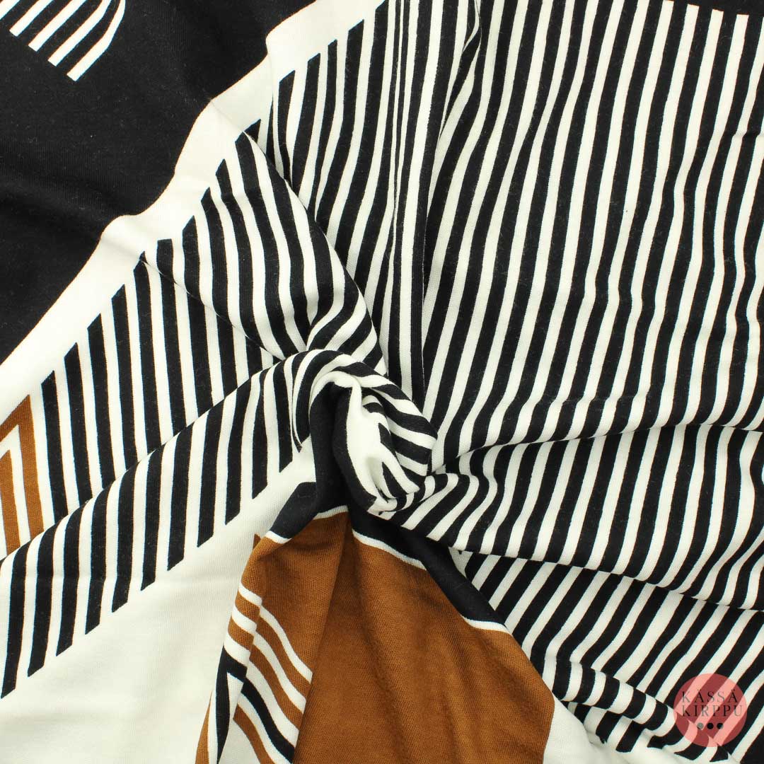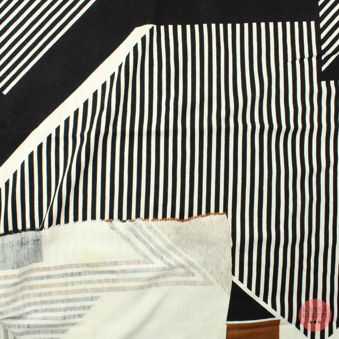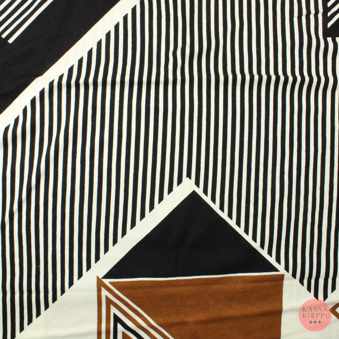Keskipaksu, leveyssuuntaan joustava ja tekokuituinen interlockneulos. Luonnonvalkoisella pohjalla musta-ruskea painettu kuvio.
