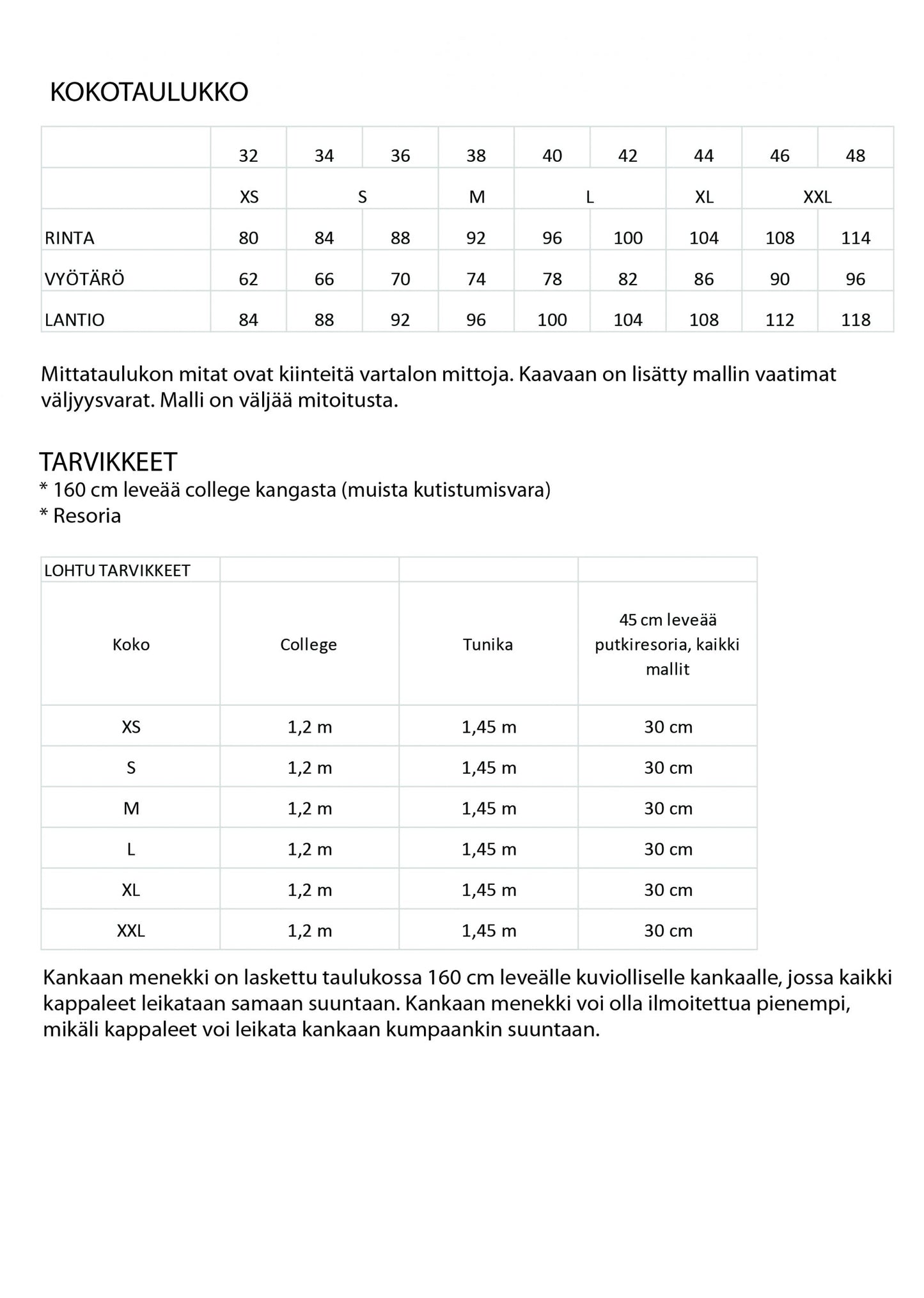 • Kokotaulukon vartalon mitoista helpottamaan koon valintaa