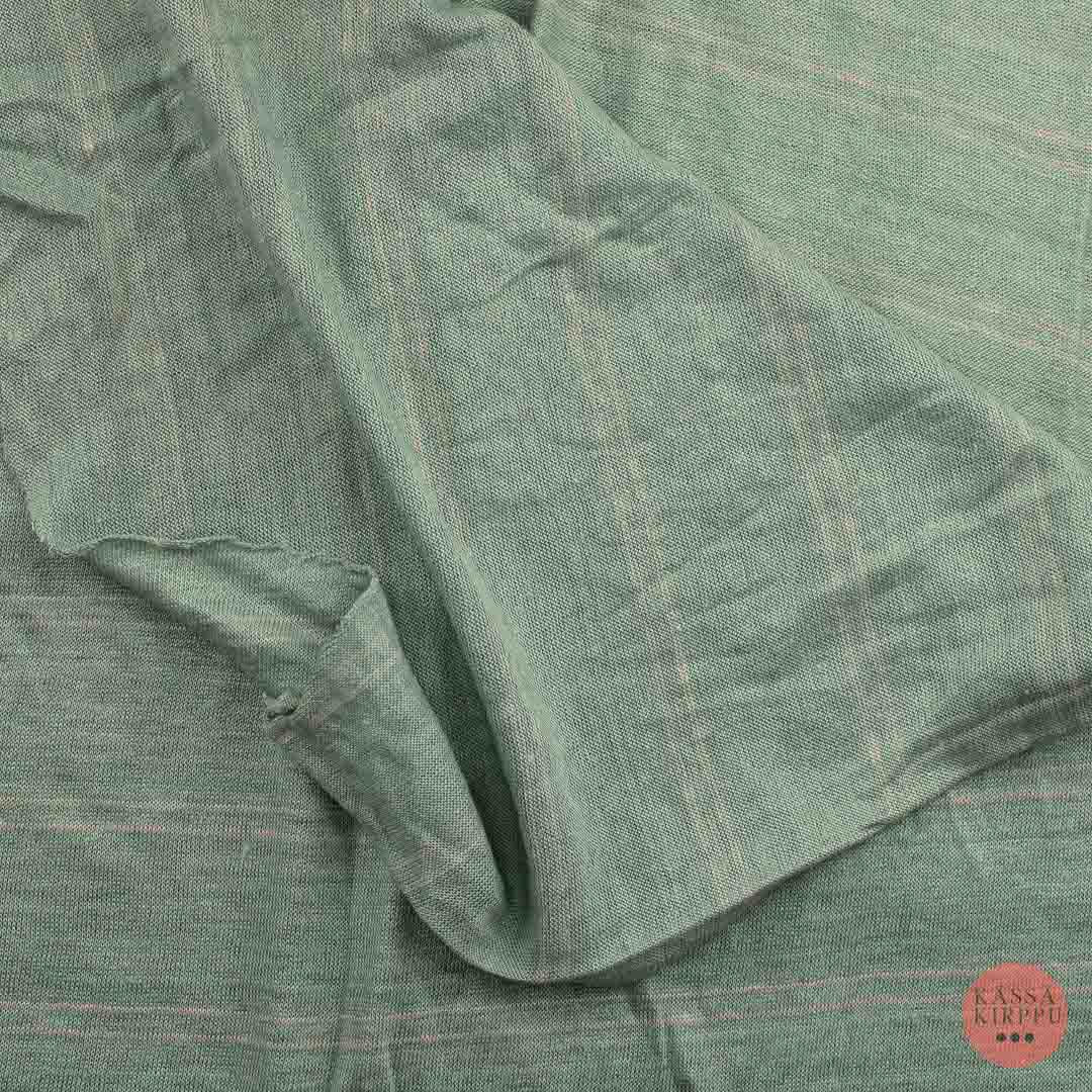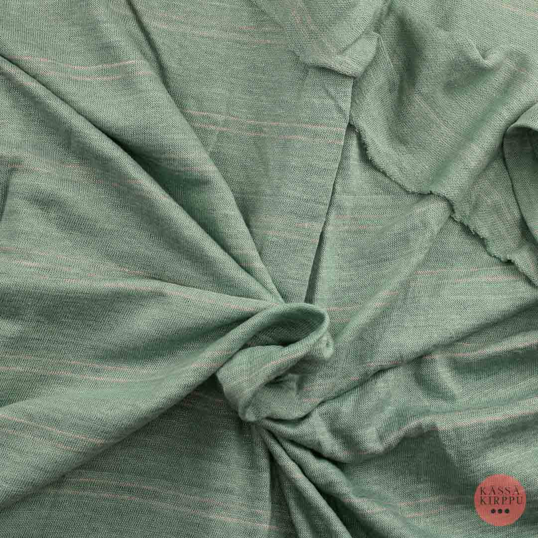 Ohut, sekoiteneulos, väri hieman meleerattu, vaakaraitoja. Joustaa vain leveyssuuntaan. Kangas kiero.