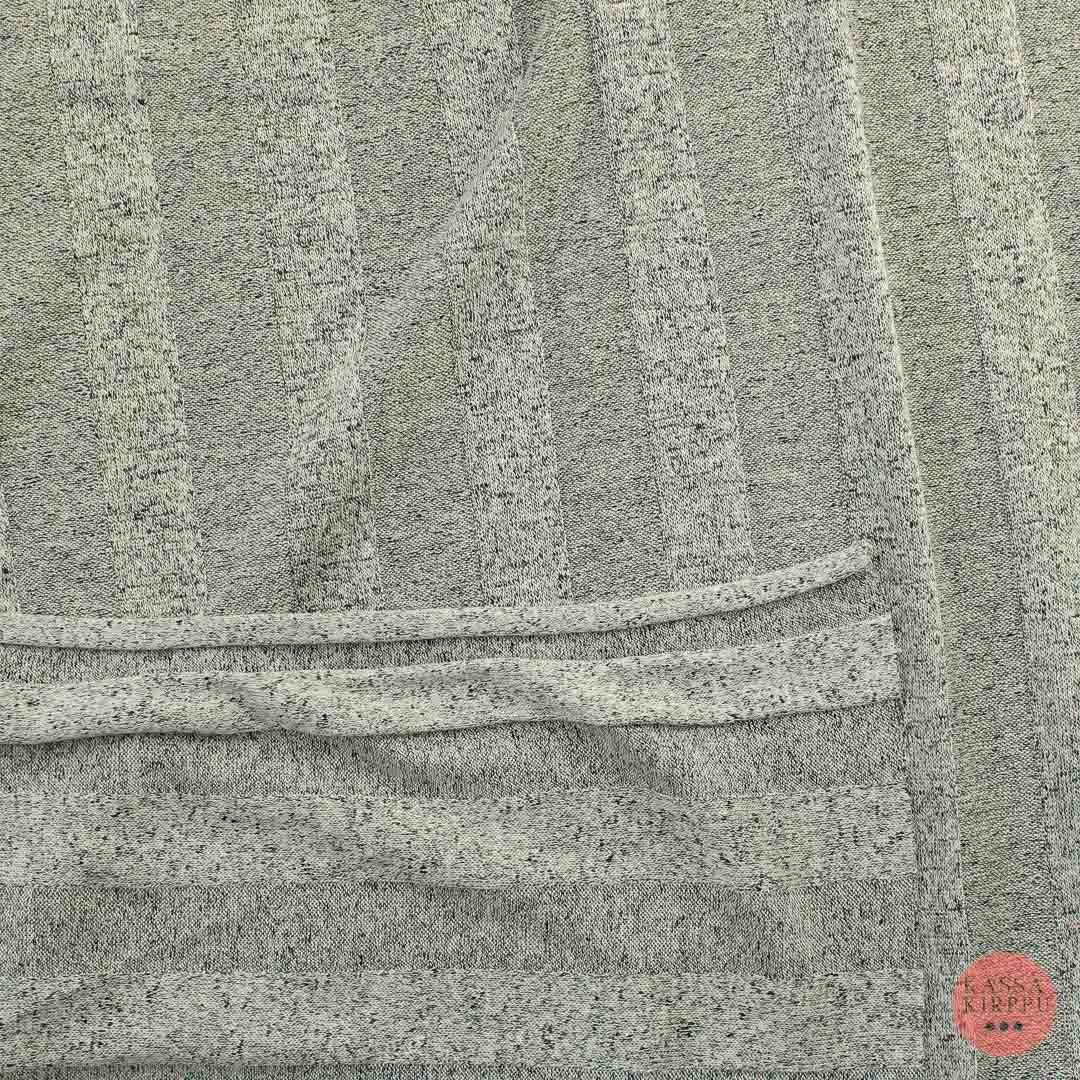 Ohut, varsinkin leveyssuuntaan joustava neulos, läpikuultava. Mahdollisesti viskoosisekoite?