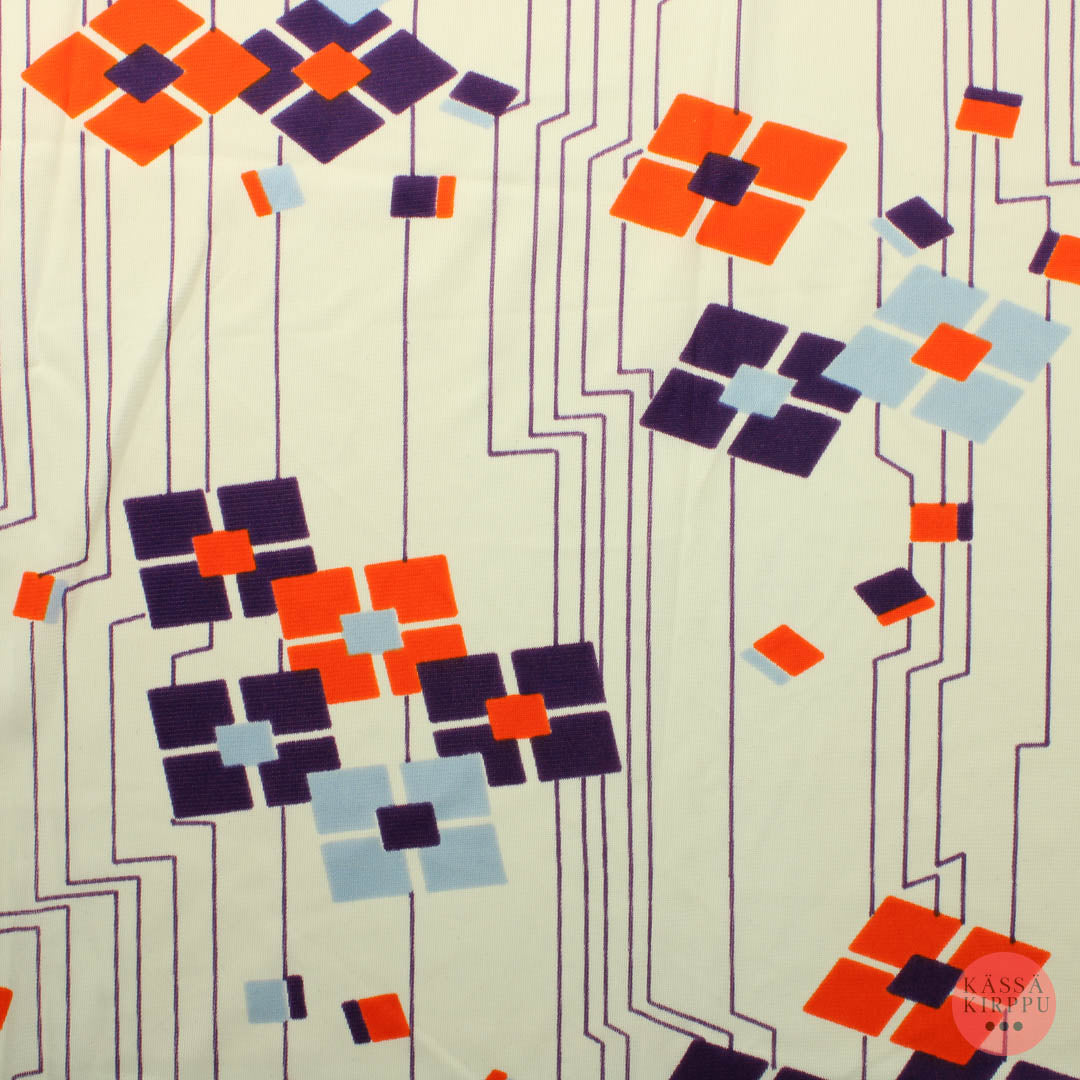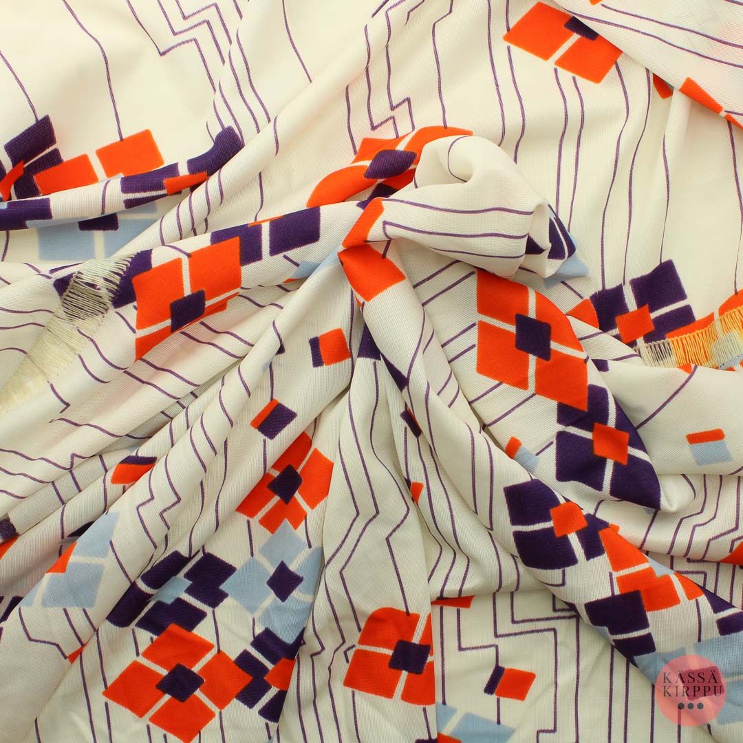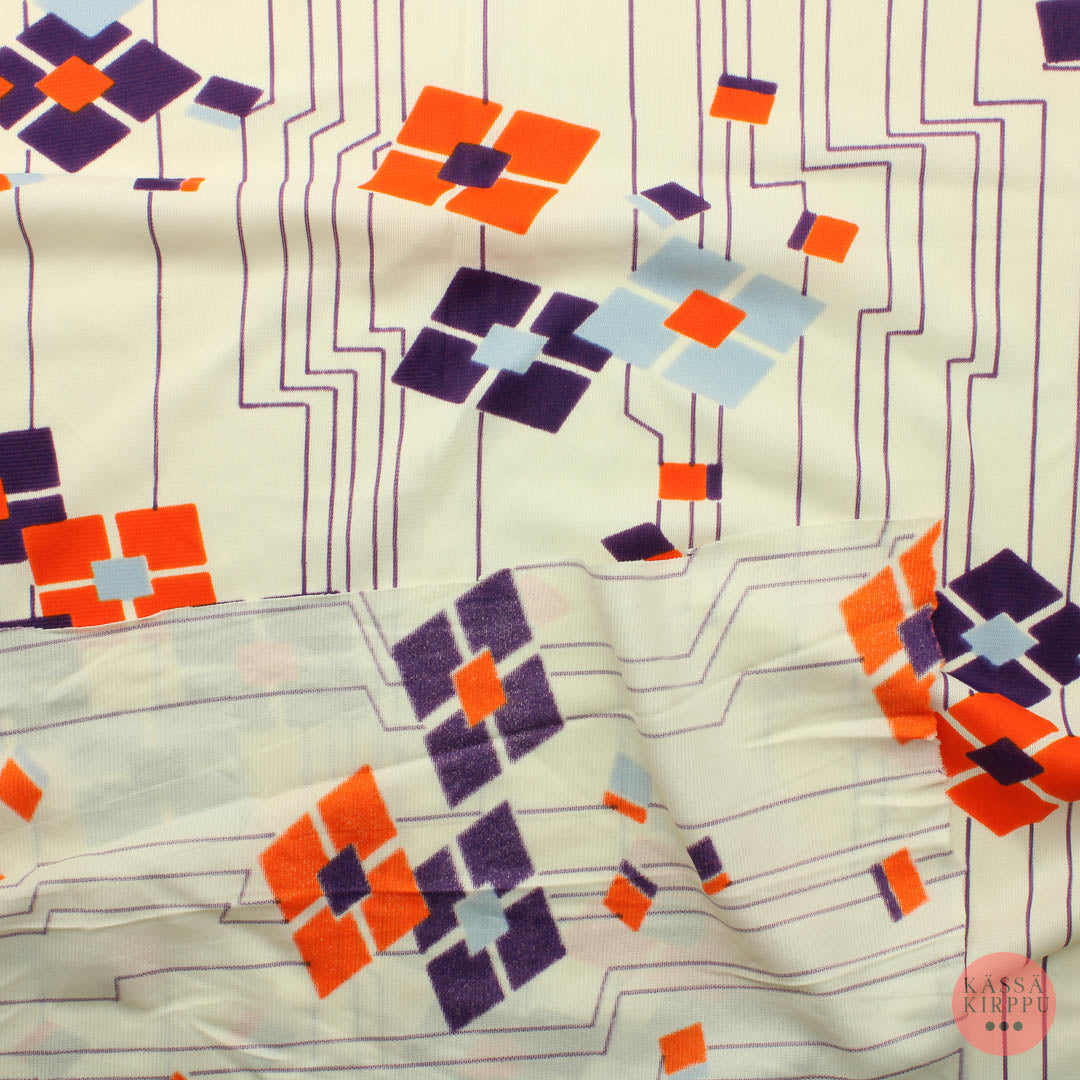 Ohut, tekokuituinen ja hieman leveyssuuntaan joustava neulos. Sopii vaikka paitoihin ja kankaan ollessa hiukan liukas, vaikkapa vuoreksi paksumpiin vaatteisiin. Kankaan keskellä jatkotikkaus.
