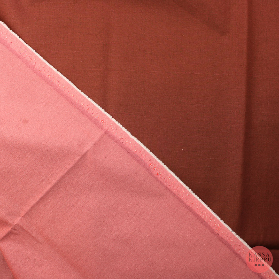 Tekokuitusekoitteinen kangas, jossa pohja lohenpunainen. Ruskeanpuoli värjätty. Kangas ohuehko, tiheäsidoksinen,