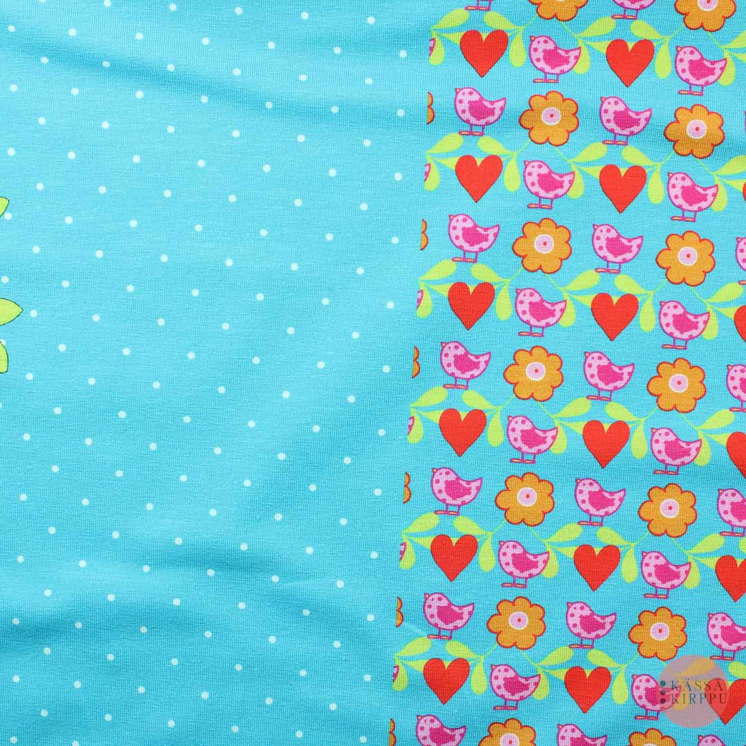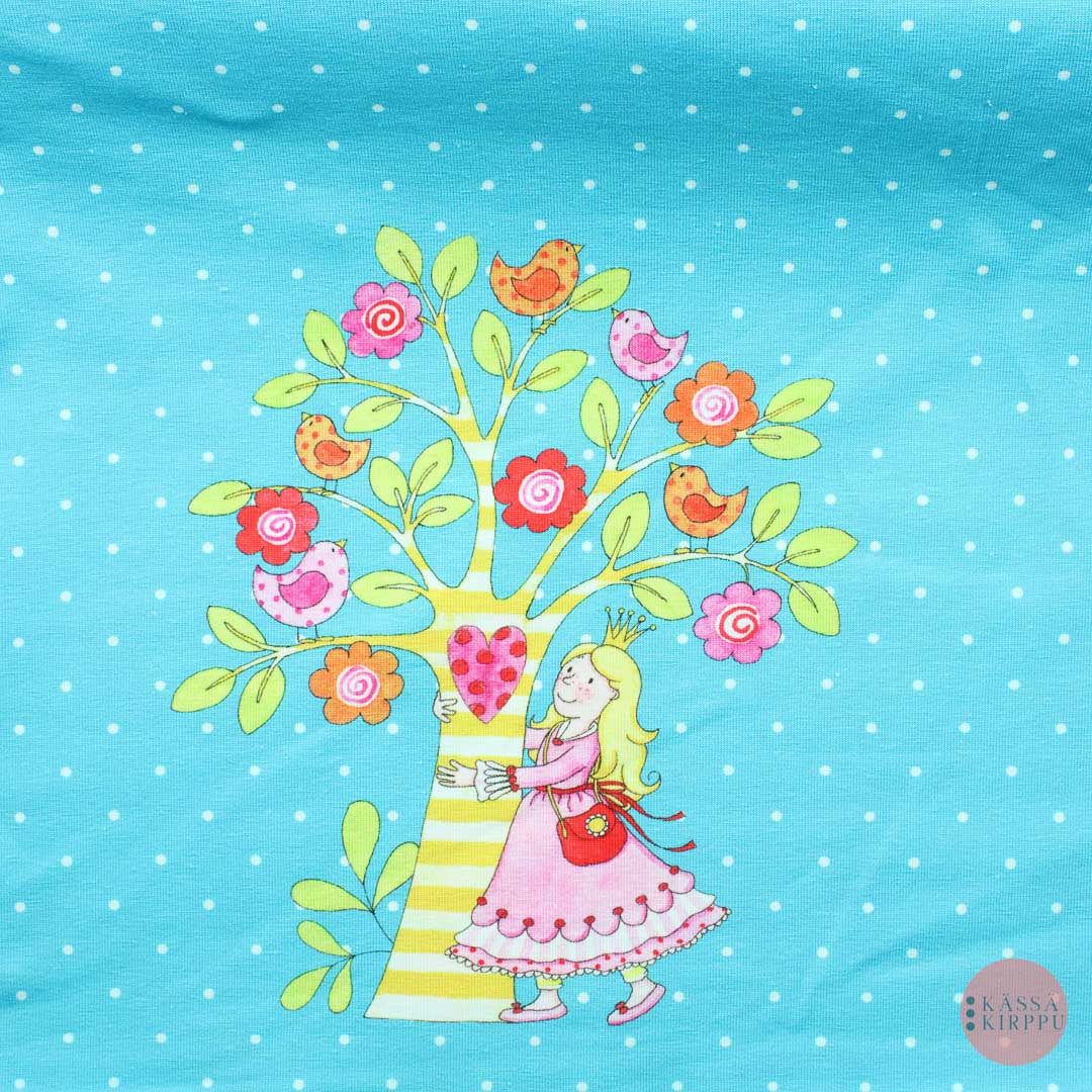 Puuvilla-elastaanitrikooraportti, jossa 42 cm leveydellä prinsessa ja puu kuvio ja loppu kangas kuvien mukaista pienikuvioista kangasta. Prinsessan ja puun koko 16x20 cm. Tunnultaan tyypillinen puuvillatrikoo: keskivahva ja pehmeä.Trikookangas sopii niin aikuisen kuin lapsenkin mieleen ja siitä valmistat muun muassa paidat, mekot, housut ja alusvaatteet.